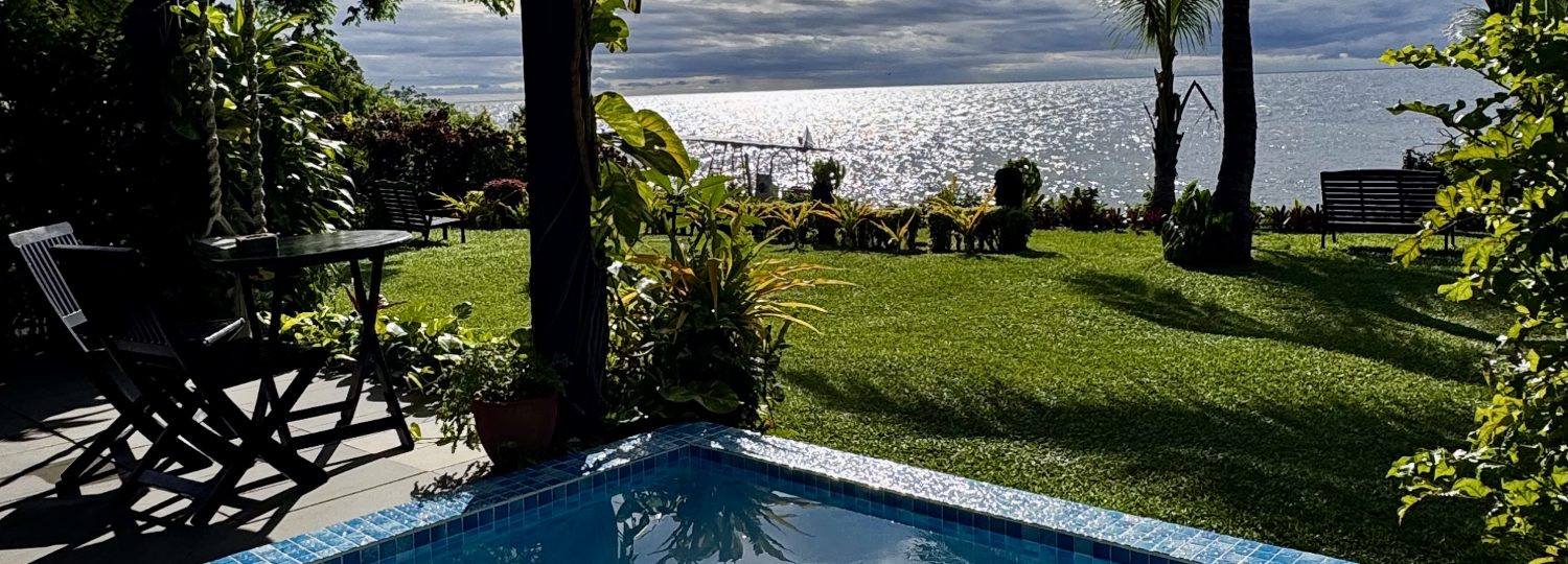 Our two (2) Luxury Oceanfront rooms (Vales in Fijian) offer a private bedroom with a King size bed. The separate lounge room has a refrigerator, tea, and coffee-making facilities, as well as comfortable lounge furniture and can be used for a sleep area. The indoor bathroom is tropically designed with a shower, toilet, bath products, and hair dryer. There is an outdoor shower in a private, lush garden. The Luxury rooms have oversized sundecks with ocean views, a day bed, couch, table and chairs, and a plunge pool. All rooms are air-conditioned.