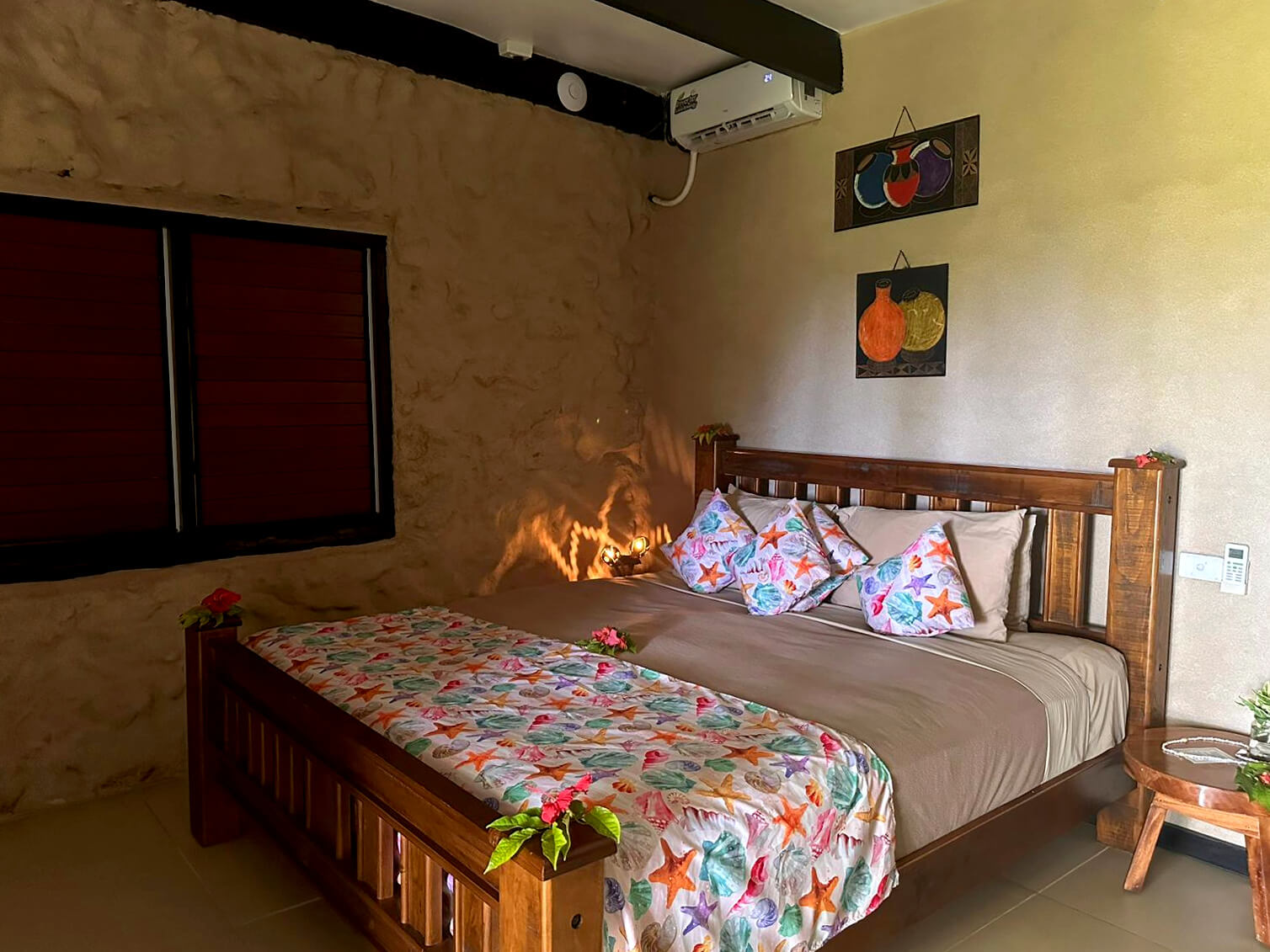 We have 6 Standard Oceanfront rooms. Triton, Nautilus, and Cowrie are situated on the North side of the property, near the dive center, with Cowrie being the closest. Wai, Coral, and Reef are on the South side of the property.